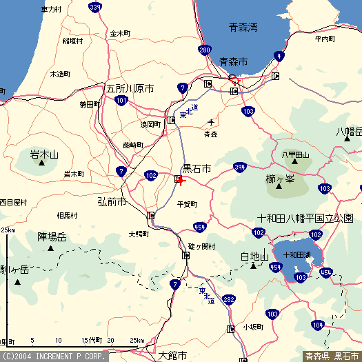 | Map around Lake Towada and Aomori city (from MapFan). |